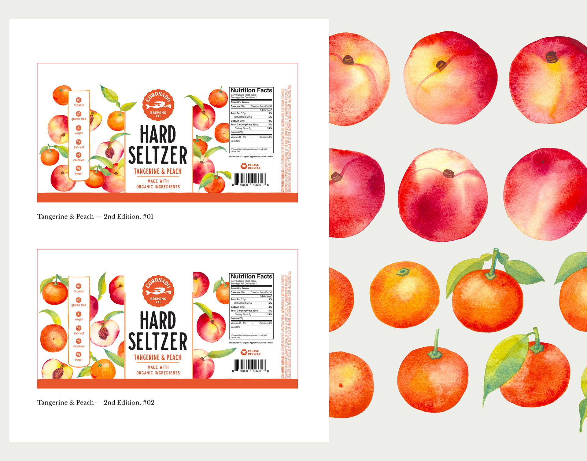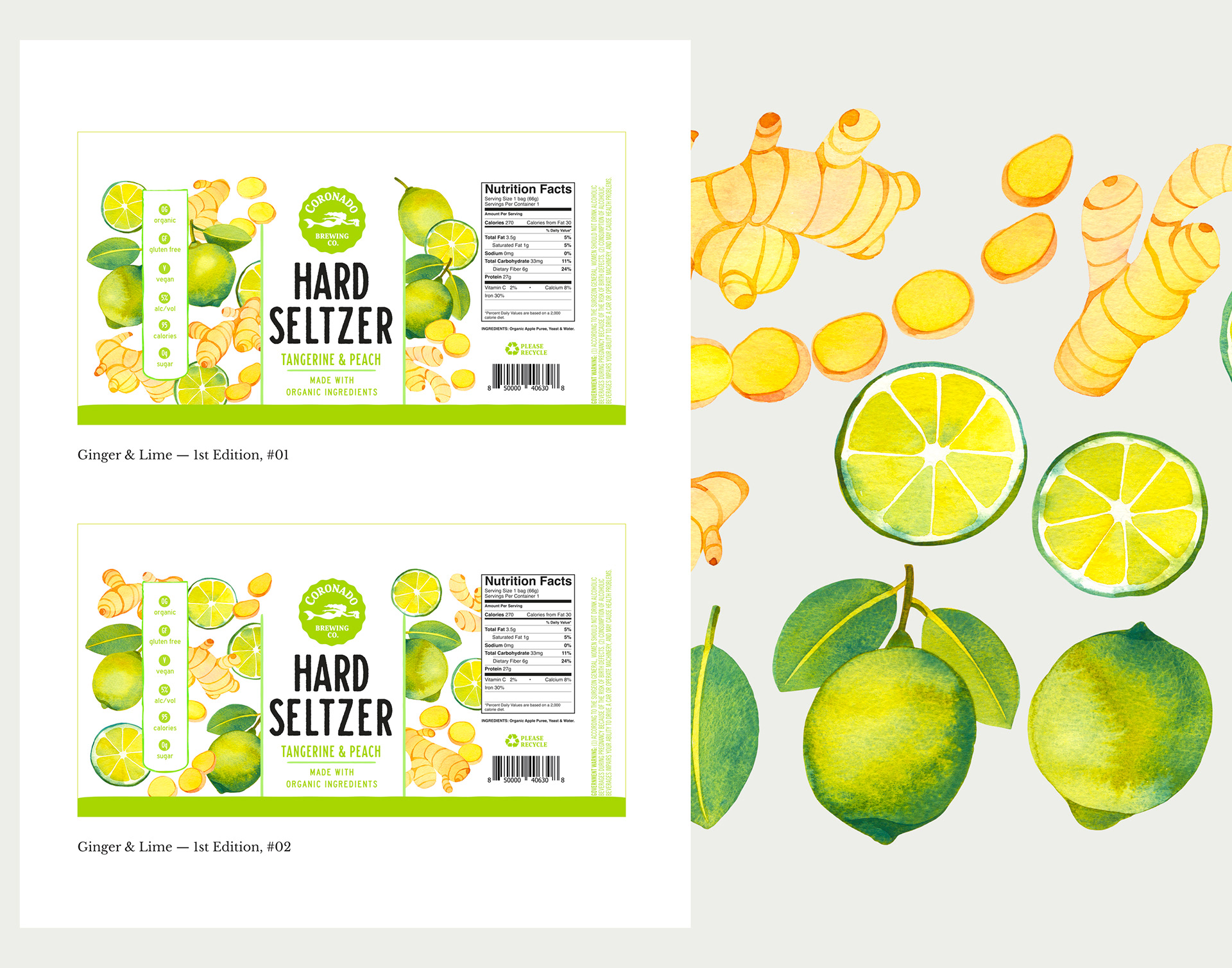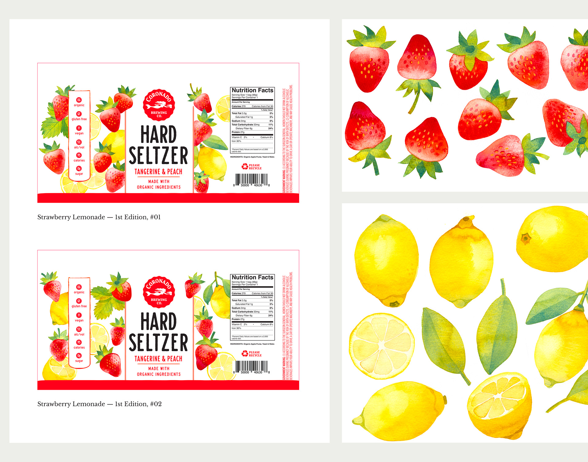The Subject Matter: Watercolor illustrations for three tastes if seltzer — Ginger & Lime, Tangerine & Peach, Strawberry Lemonade.
