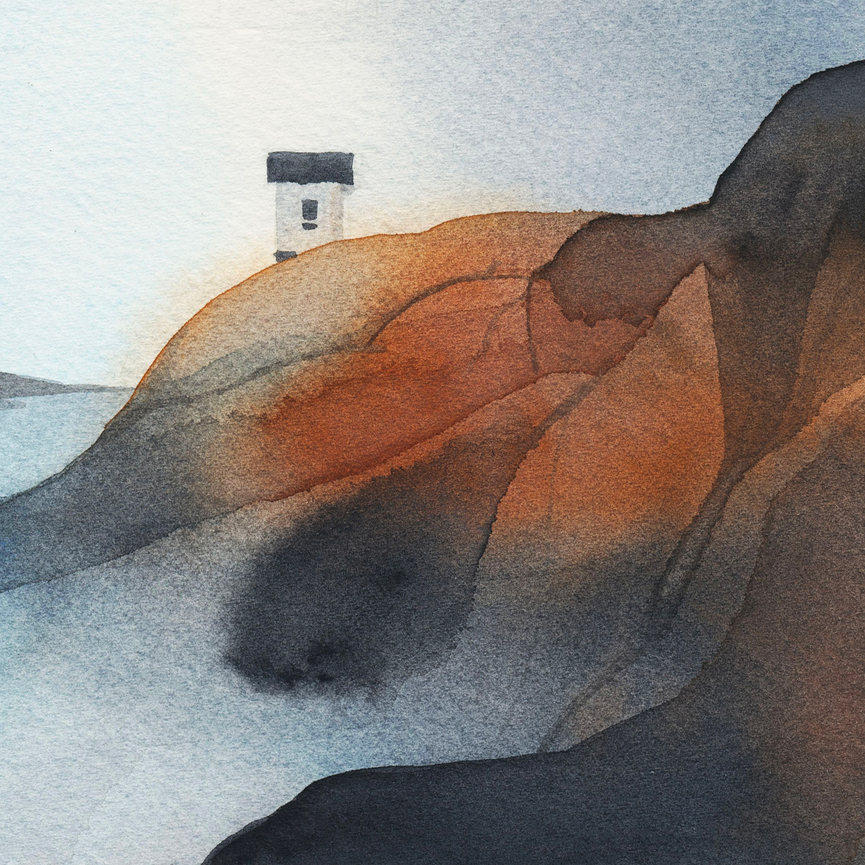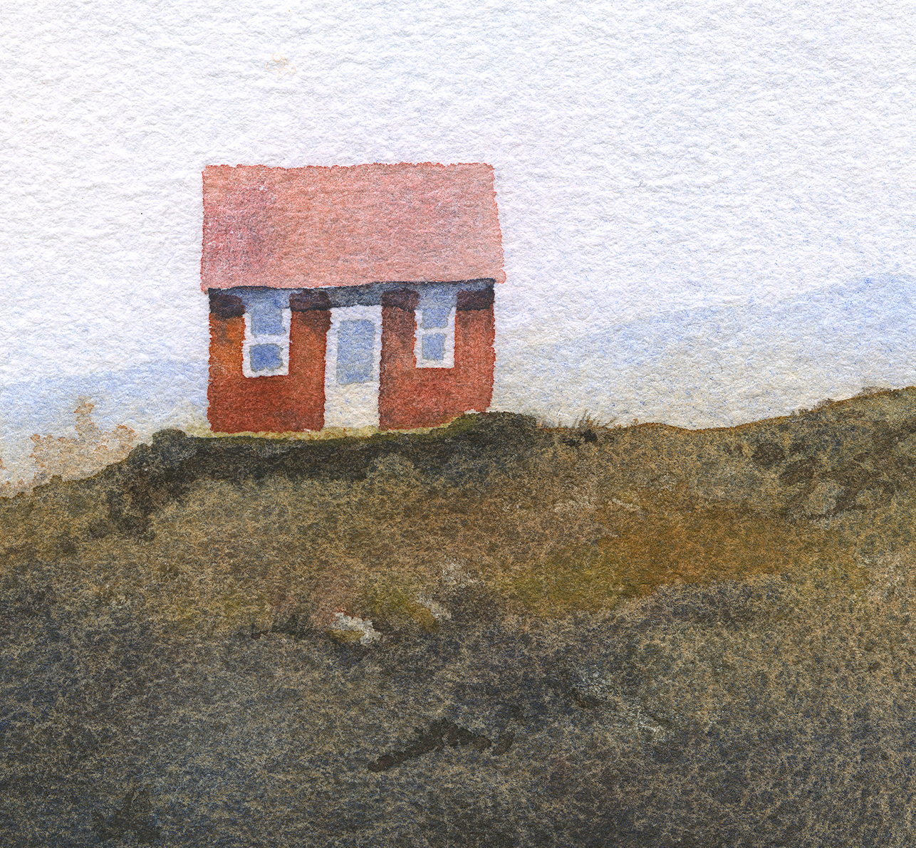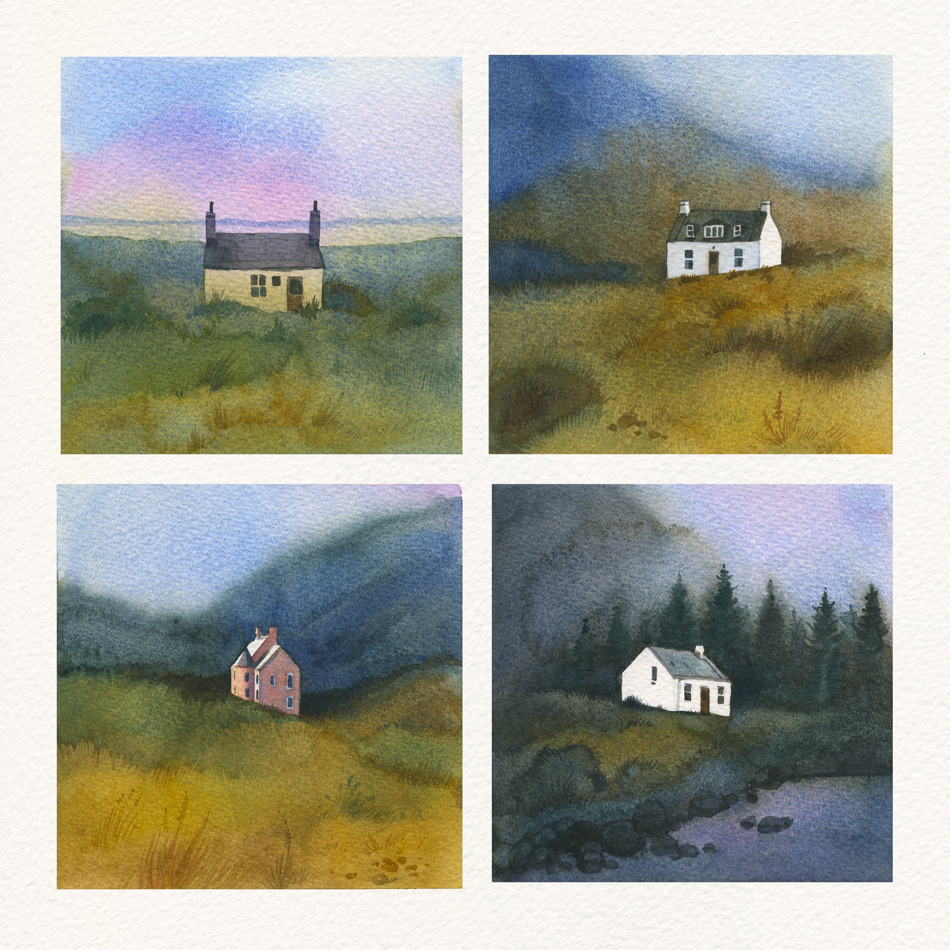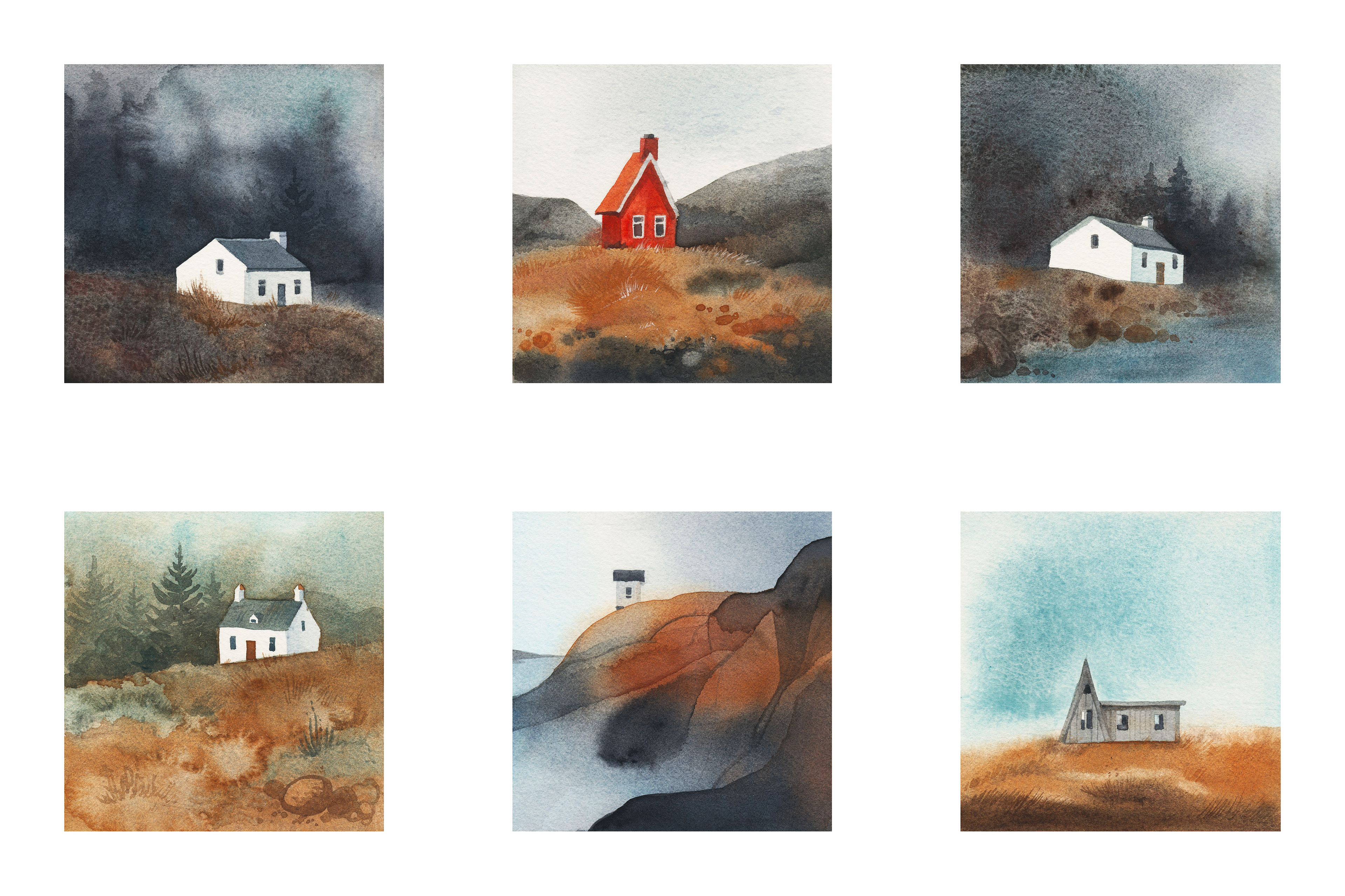 A series of watercolour paintings featuring tiny houses in calm, atmospheric landscapes