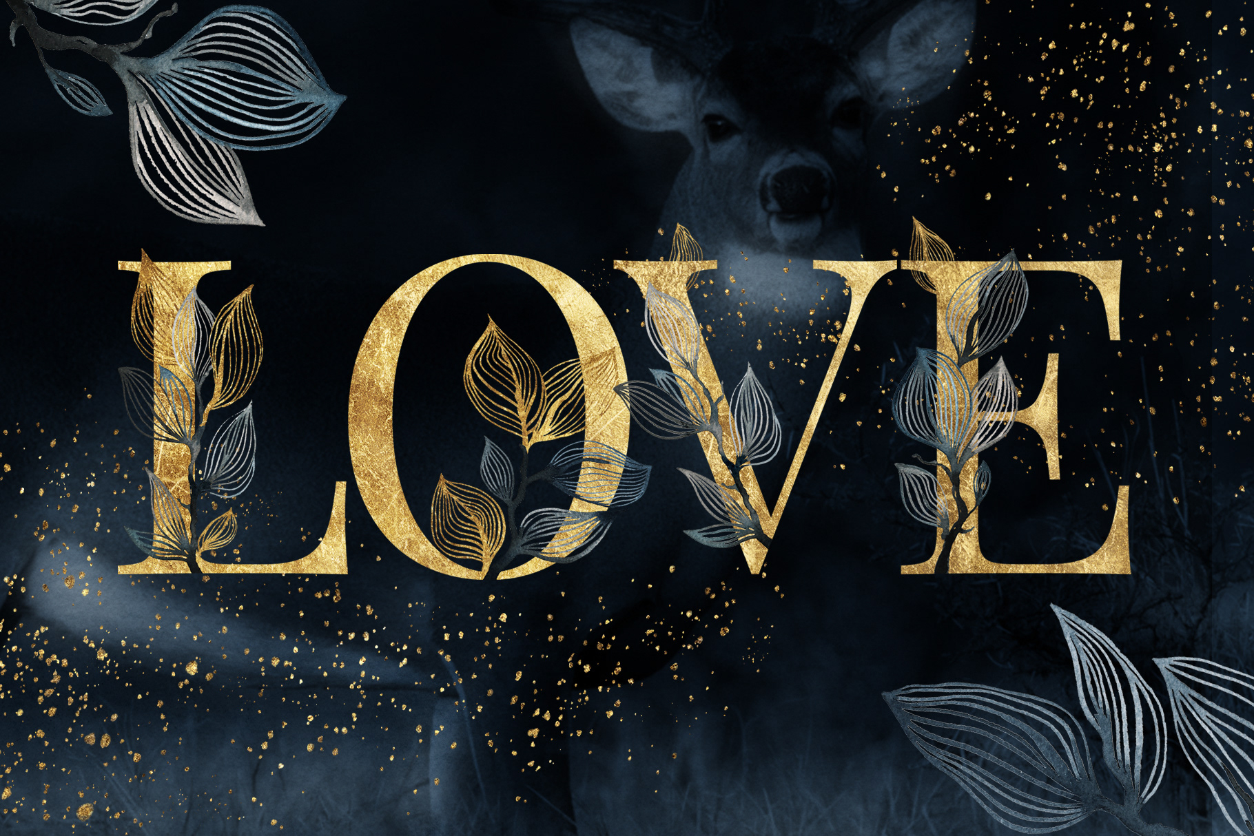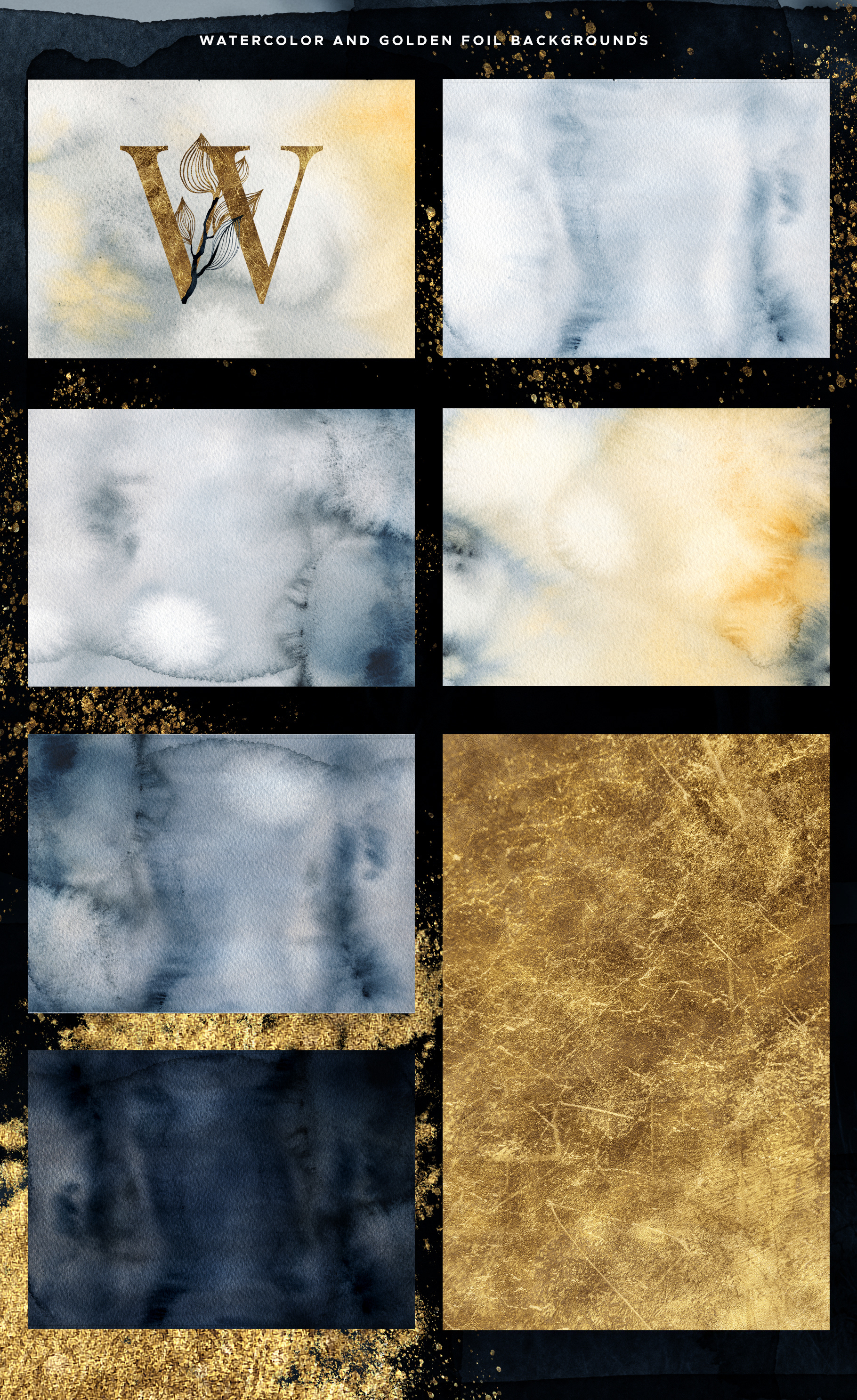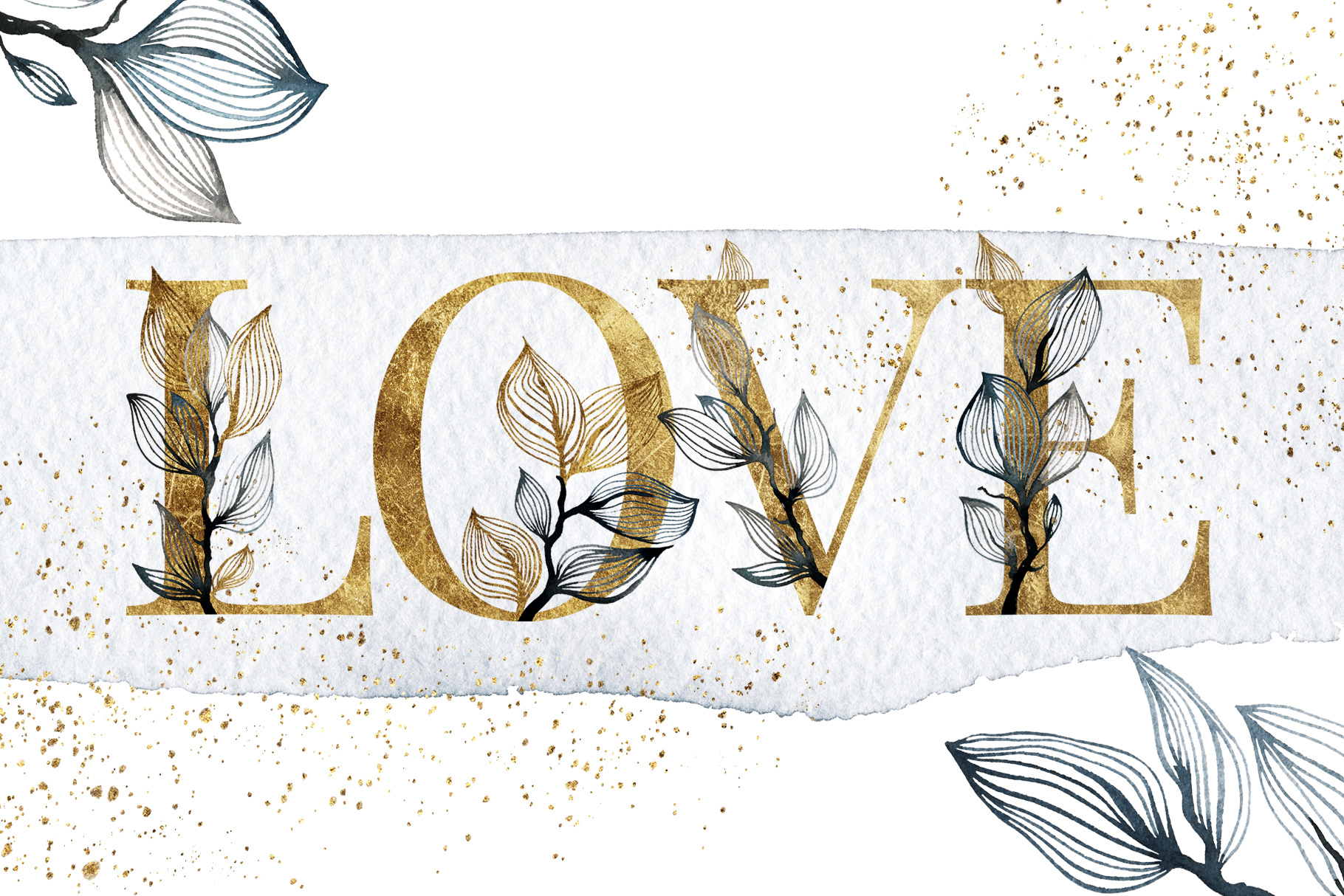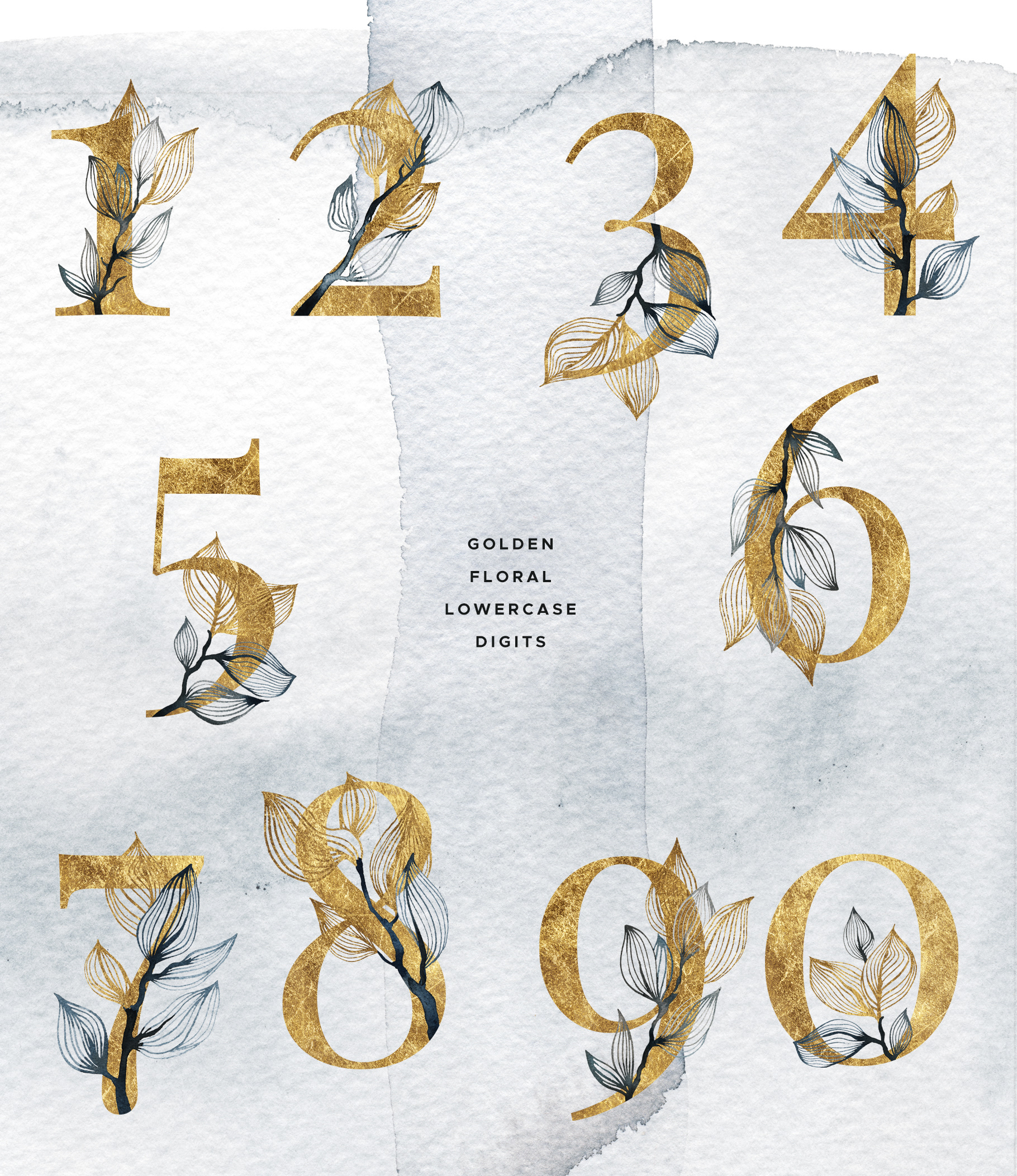 OLA watercolor and gold graphic collection contains 165 items — leaves, branches, frames, letters, digits, splotches and backgrounds. The color scheme is black watercolor and golden texture — an evergreen classic! This collection would work for all sorts of design projects including but not limited to branding and stationary designs, DIY projects, blogging and social media posts, photography backgrounds and more.