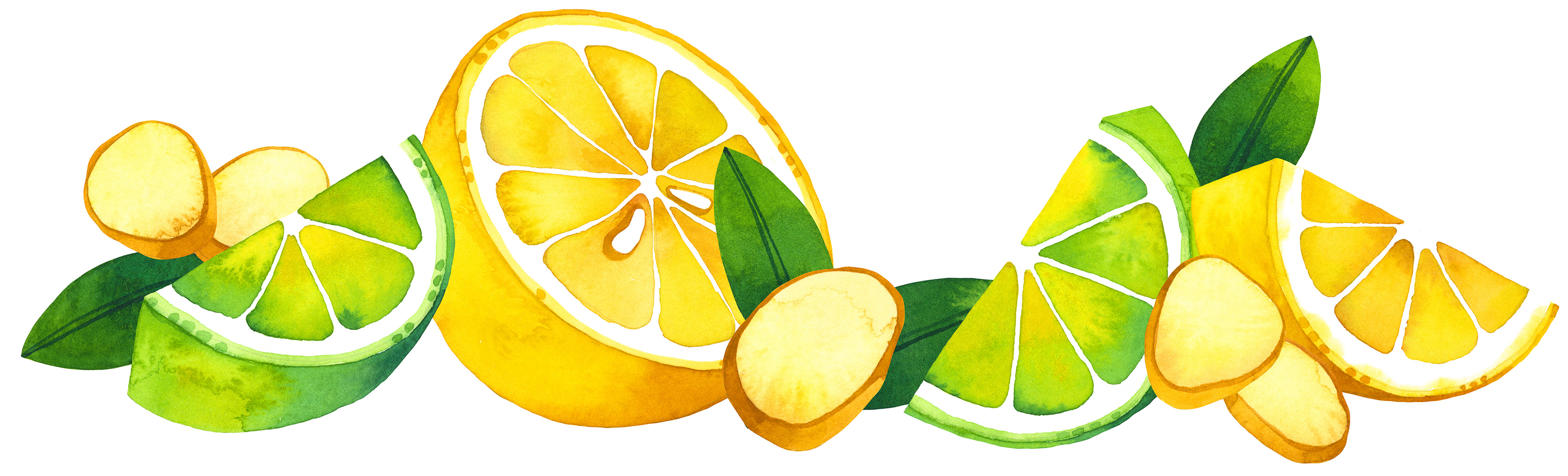 The Subject Matter: Watercolor illustrations for three tastes of Immunity Sparkling Drinks — Ginger, Lemon & Lime, Orange & Turmeric, Blackberry & Elderberry.